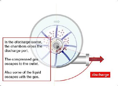the liquid ring segment between two blades is acting like a piston causing intake, compression and discharge.